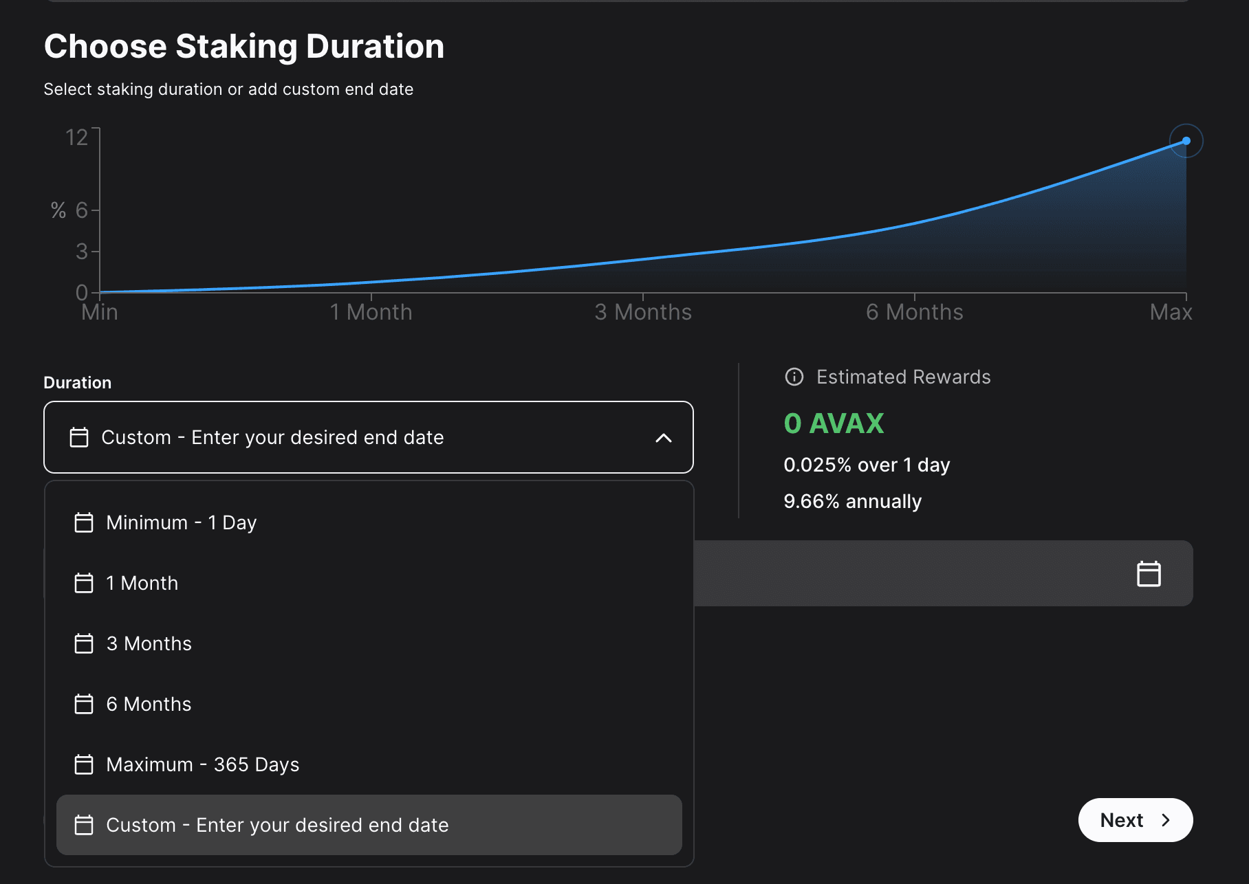 Here, you'll need to choose the staking duration. There are predefined values, like 1 day, 1 month and so on. You can also choose a custom period of time. For this example, 22 days were chosen.
