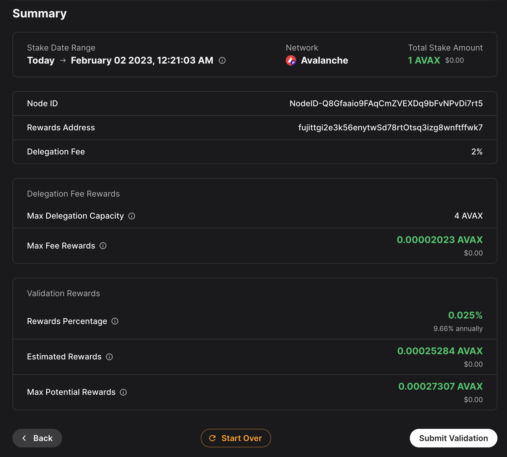 - Stake Amount: The amount of AVAX to lock for staking. On Mainnet, the minimum required amount is 2,000 AVAX. On Testnet the minimum required amount is 1 AVAAX.